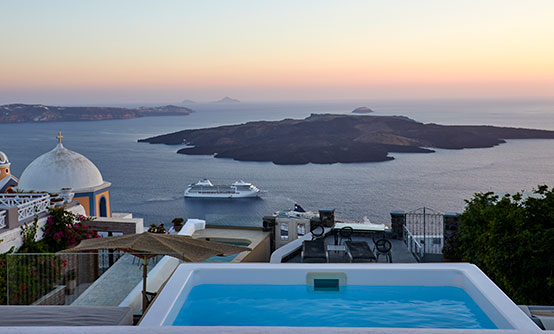 accommodation with breathtaking views to the volcano and the Aegean sea, in an elegantly minimal ambience.